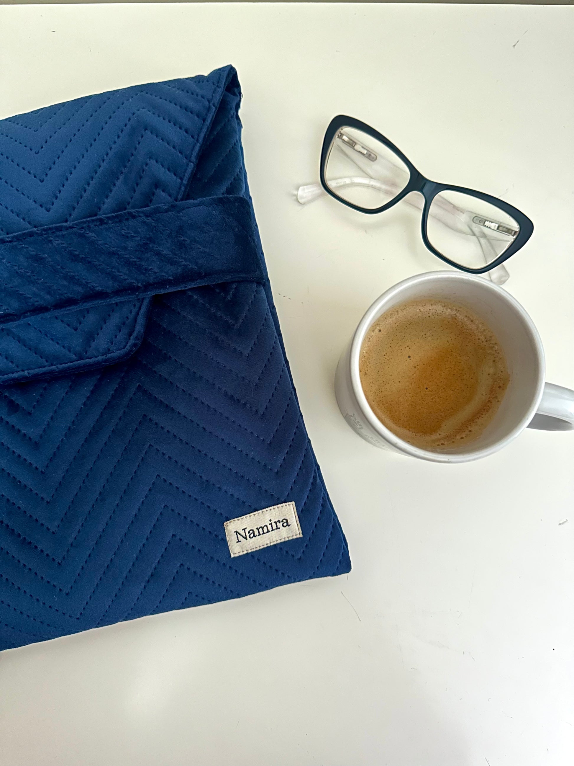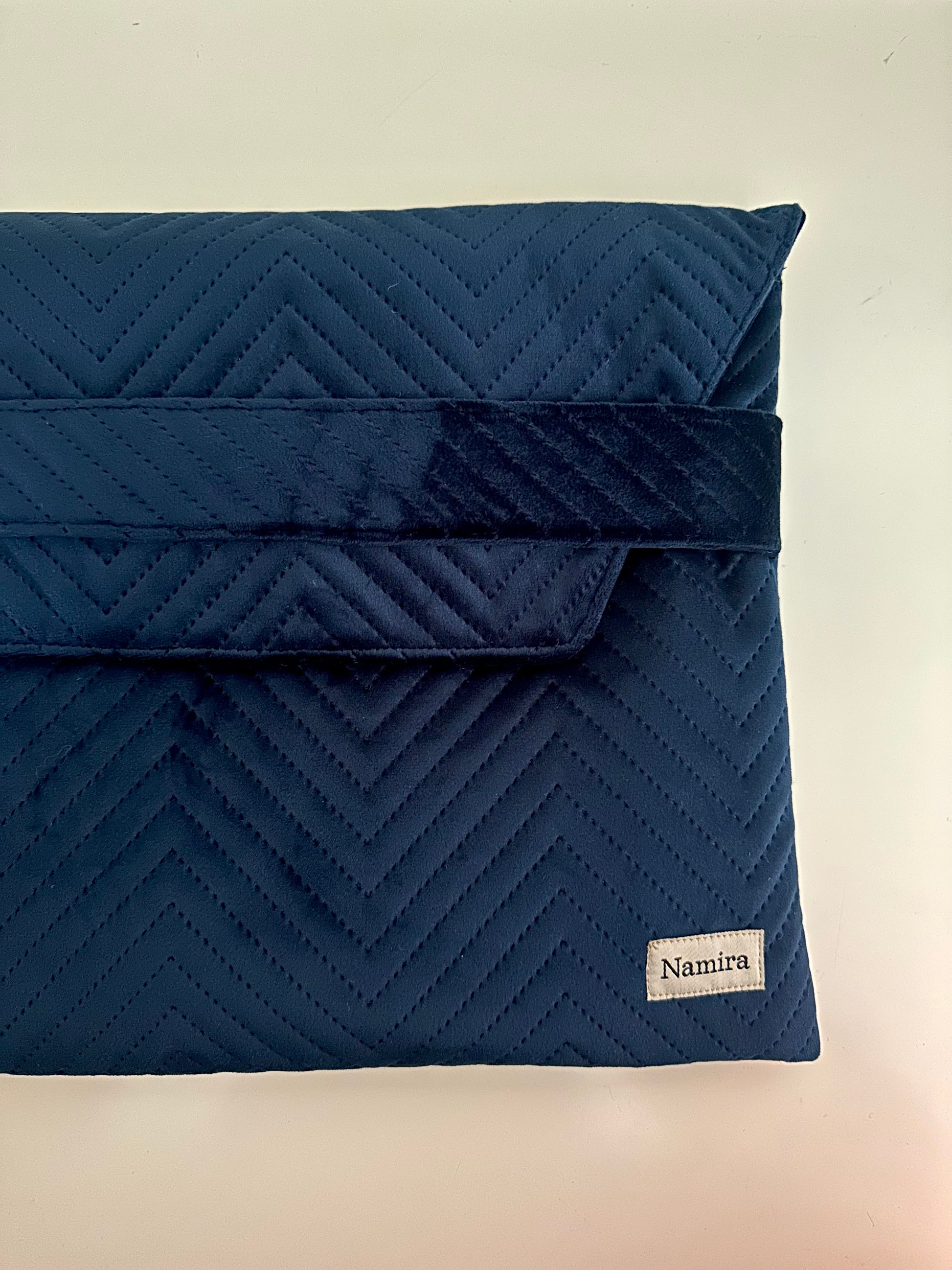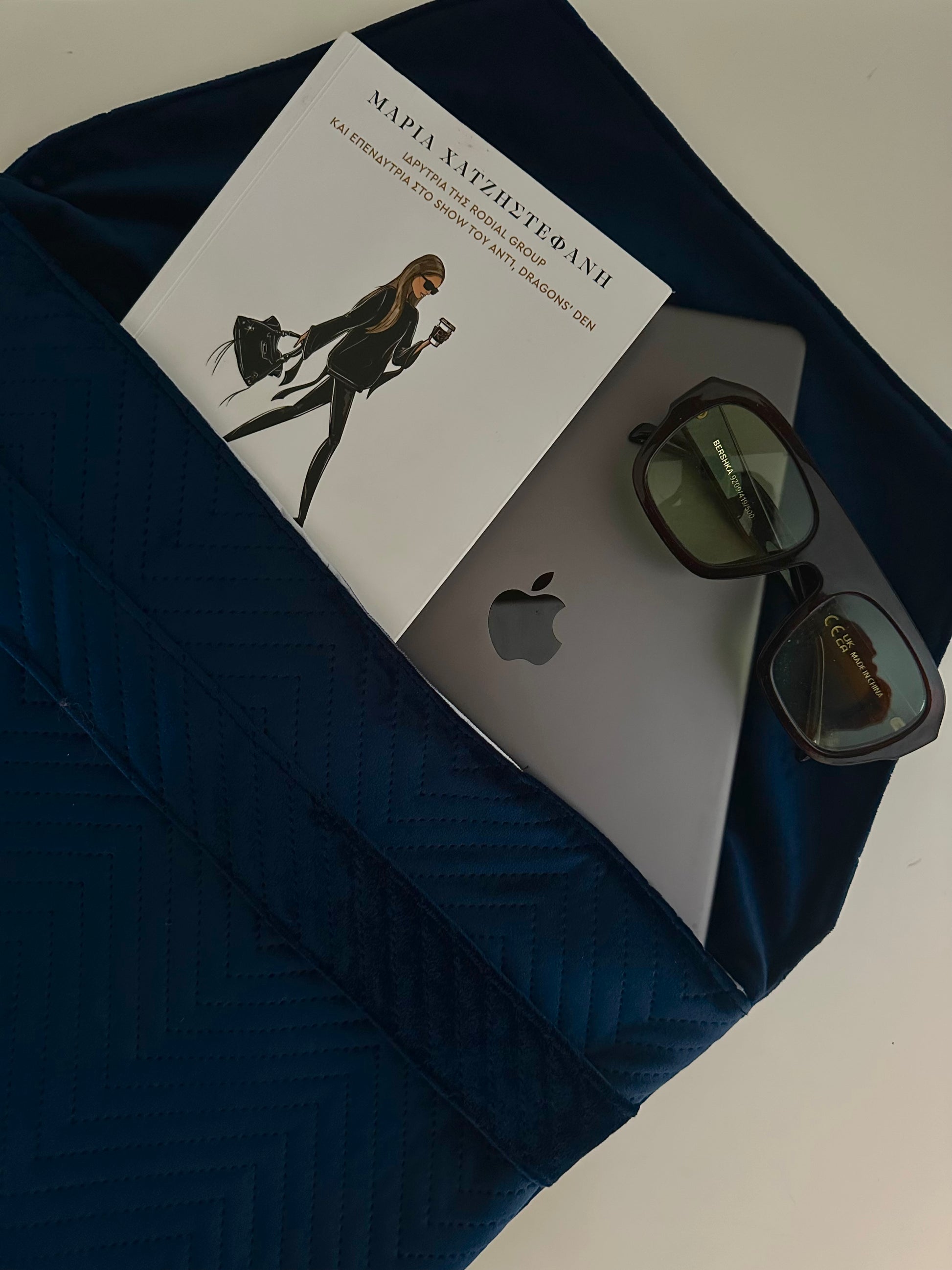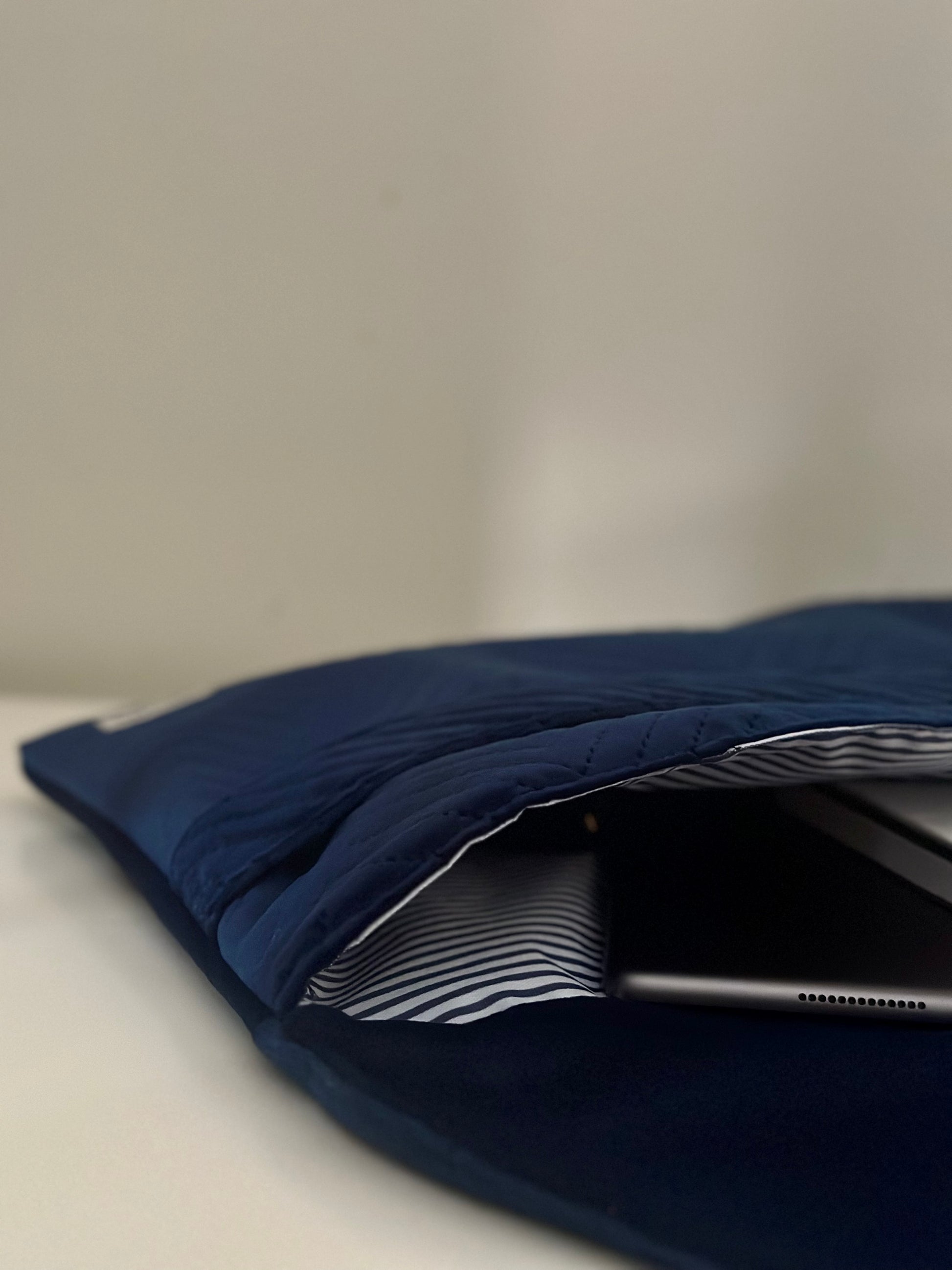 Τσάντα λάπτοπ σε ένα μοναδικό velvet ύφασμα, αλλά και σε αυτό το εντυπωσιακό μπλε χρώμα. Εσωτερική ριγέ φόδρα σε λευκό-μπλε χρώμα και καπάκι ώστε να κλείνει. Σχεδιασμένη να χωράει λάπτοπ έως 15 ίντσες, αλλά και ιδανική για βιβλία, τάμπλετ και τετράδια.
