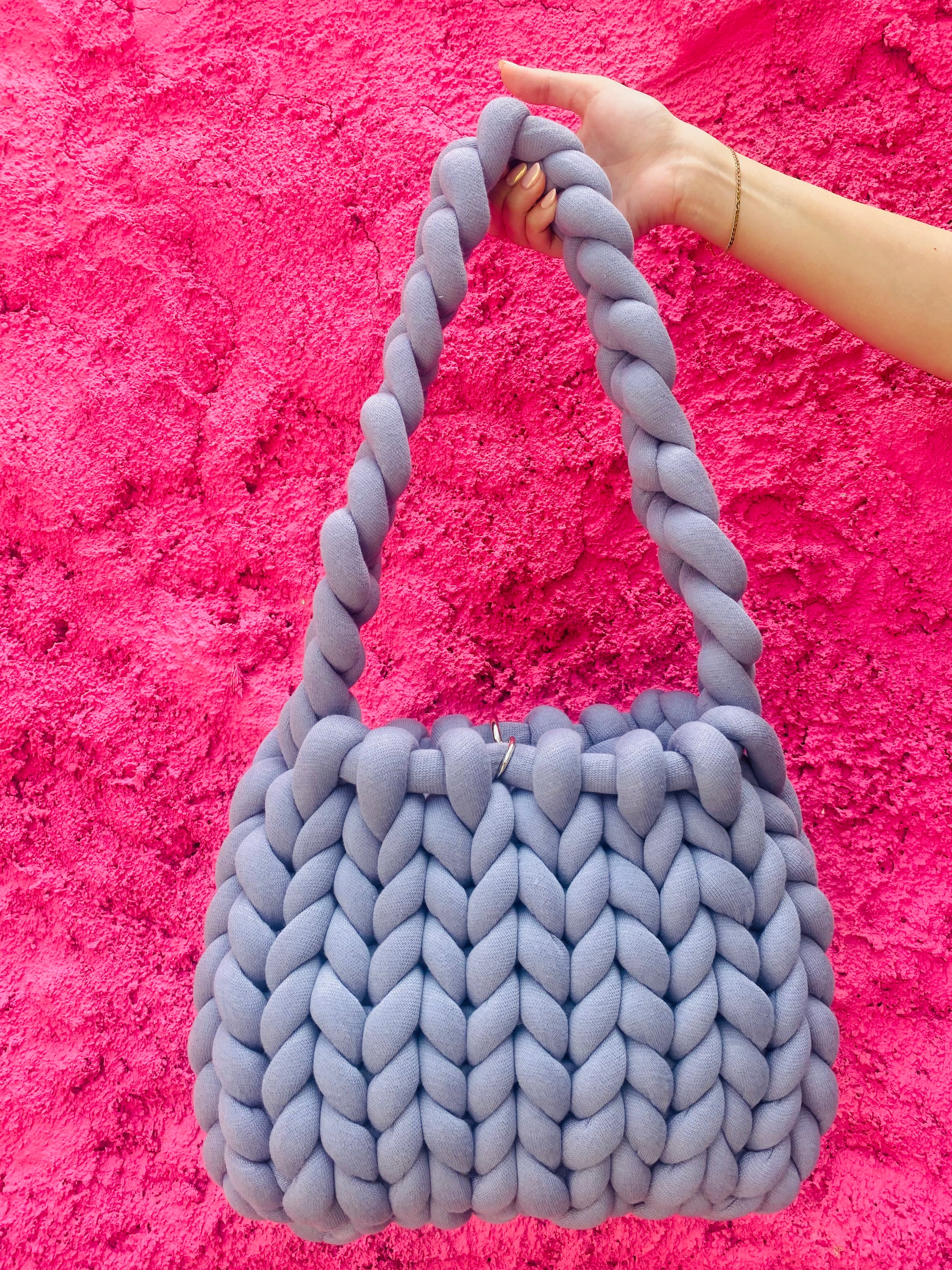 Χειροποίητη πλεκτή τσάντα σε box size και γκρι χρώμα. Σφιχτή πλέξη από 60% βαμβακερό νήμα και 40% εσωτερική γέμιση πολυεστέρα. Εσωτερικός χώρος κατάλληλος για τα απαραίτητα προσωπικά αντικείμενα, φοριέται στον ώμο ή στο χέρι, ενώ μπορεί να προσαρμοστεί και χιαστί, κατόπιν παραγγελίας. Κούμπωμα από δύο μεταλλικούς κρίκους.
