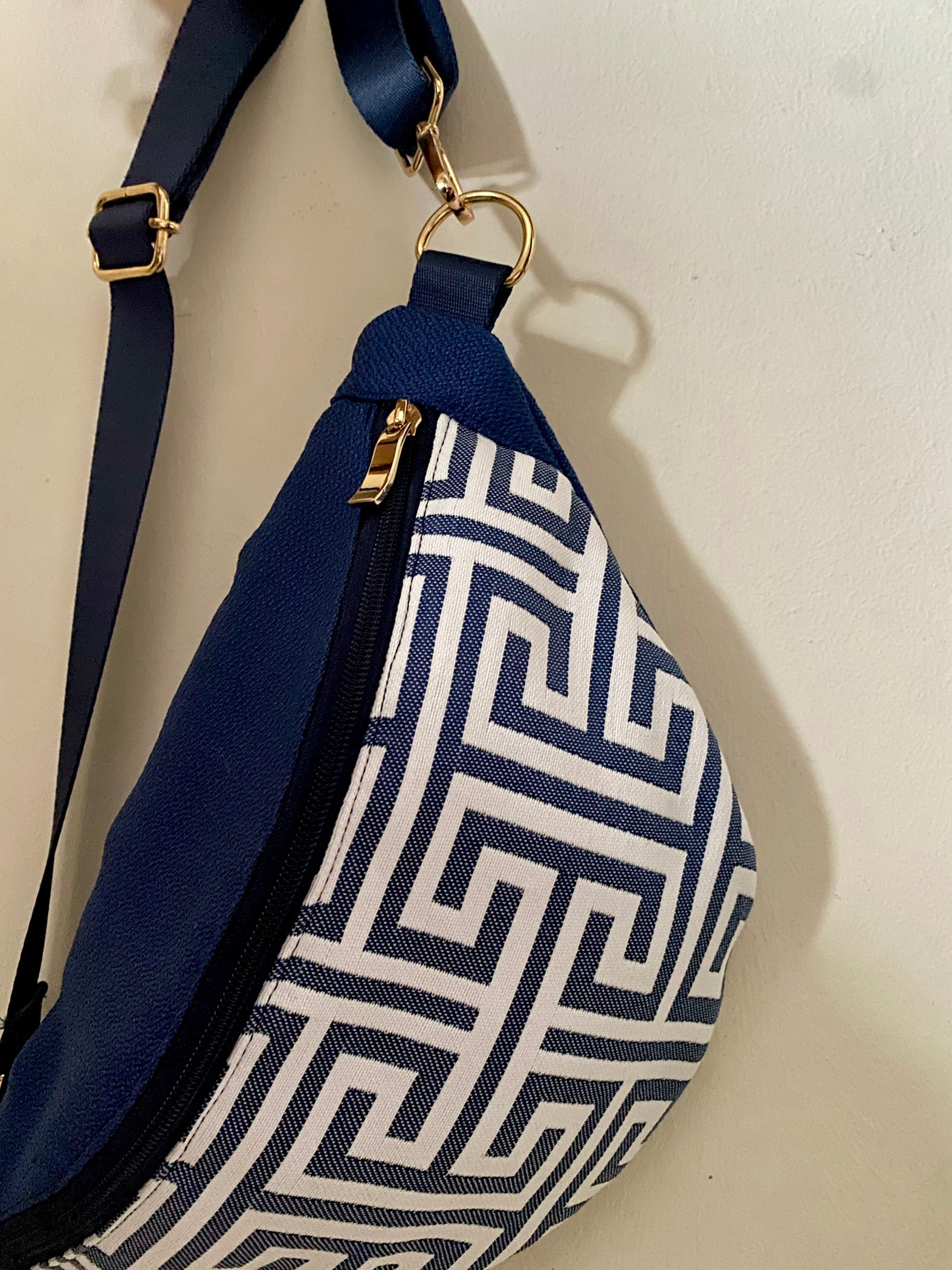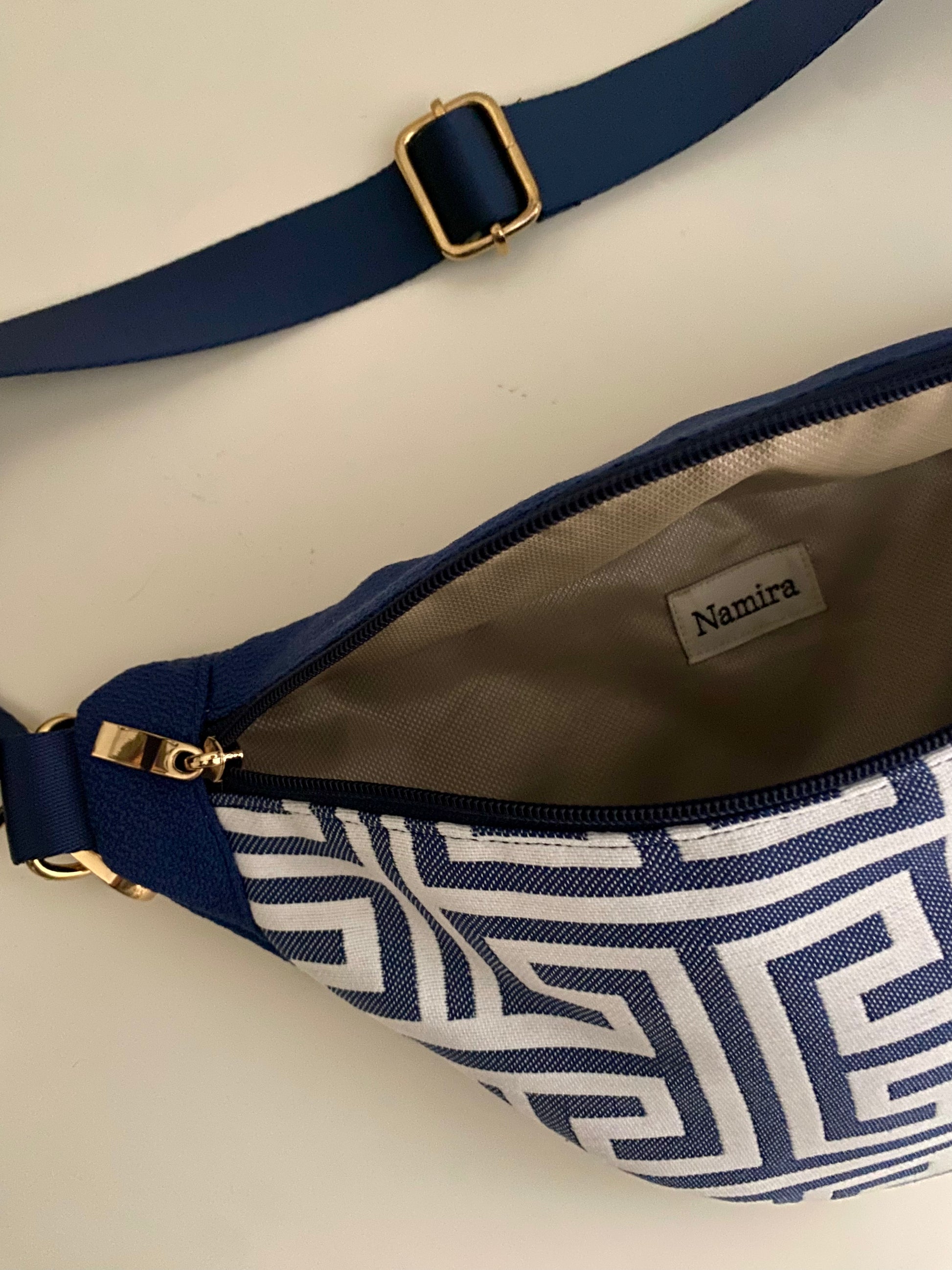 Χειροποίητη τσάντα μπανάνα, κατασκευασμένη από ένα υψηλής ποιότητας σταθερό ύφασμα με χρωματισμούς: μπλε και λευκό. Χρυσές λεπτομέρειες, εσωτερική φόδρα, φερμουάρ και ιμάντα που αυξομειώνει όπως σας εξυπηρετεί. Ιδανική και βολική για καθημερινή χρήση με άκρως ικανοποιητική χωρητικότητα.