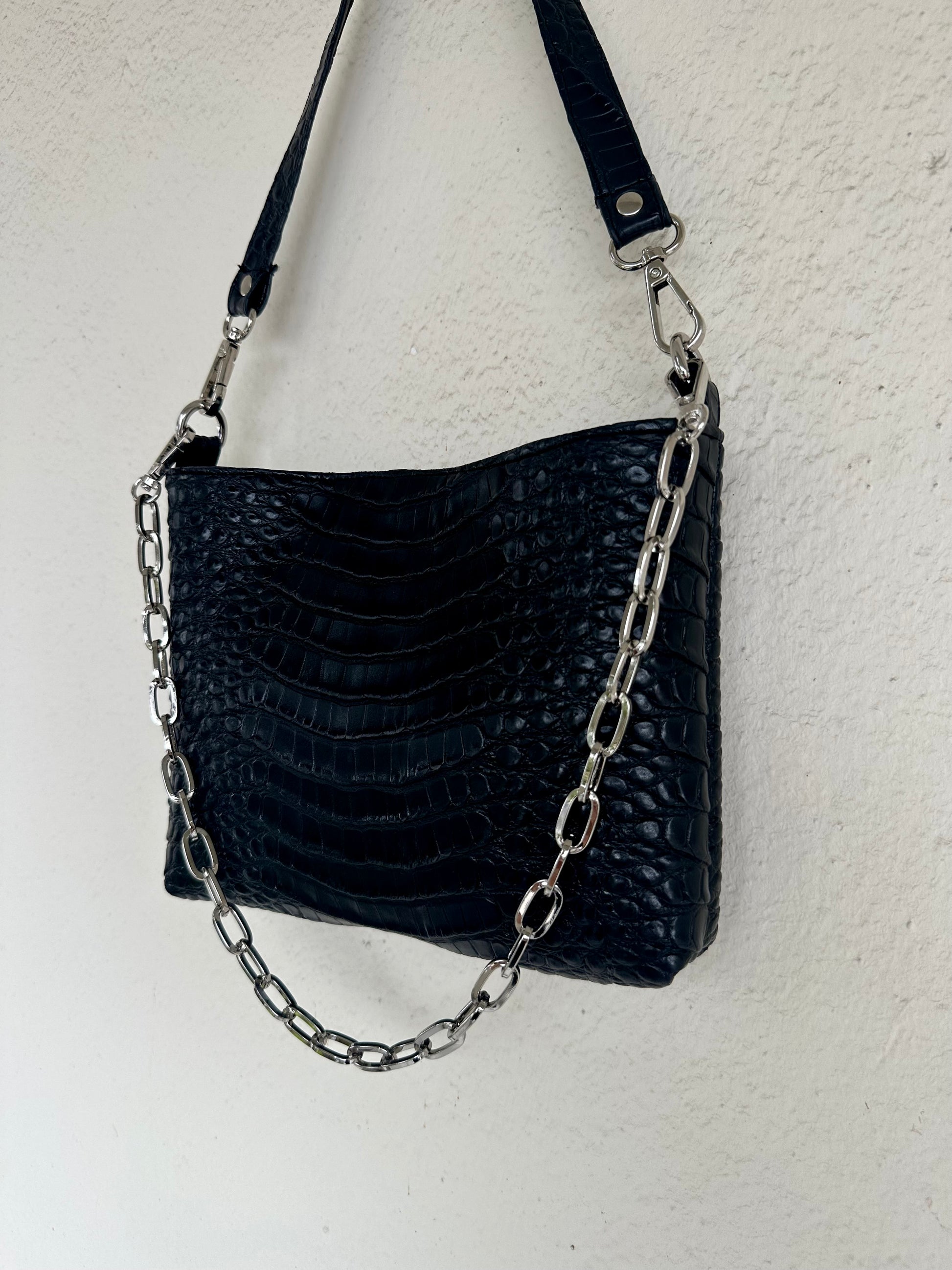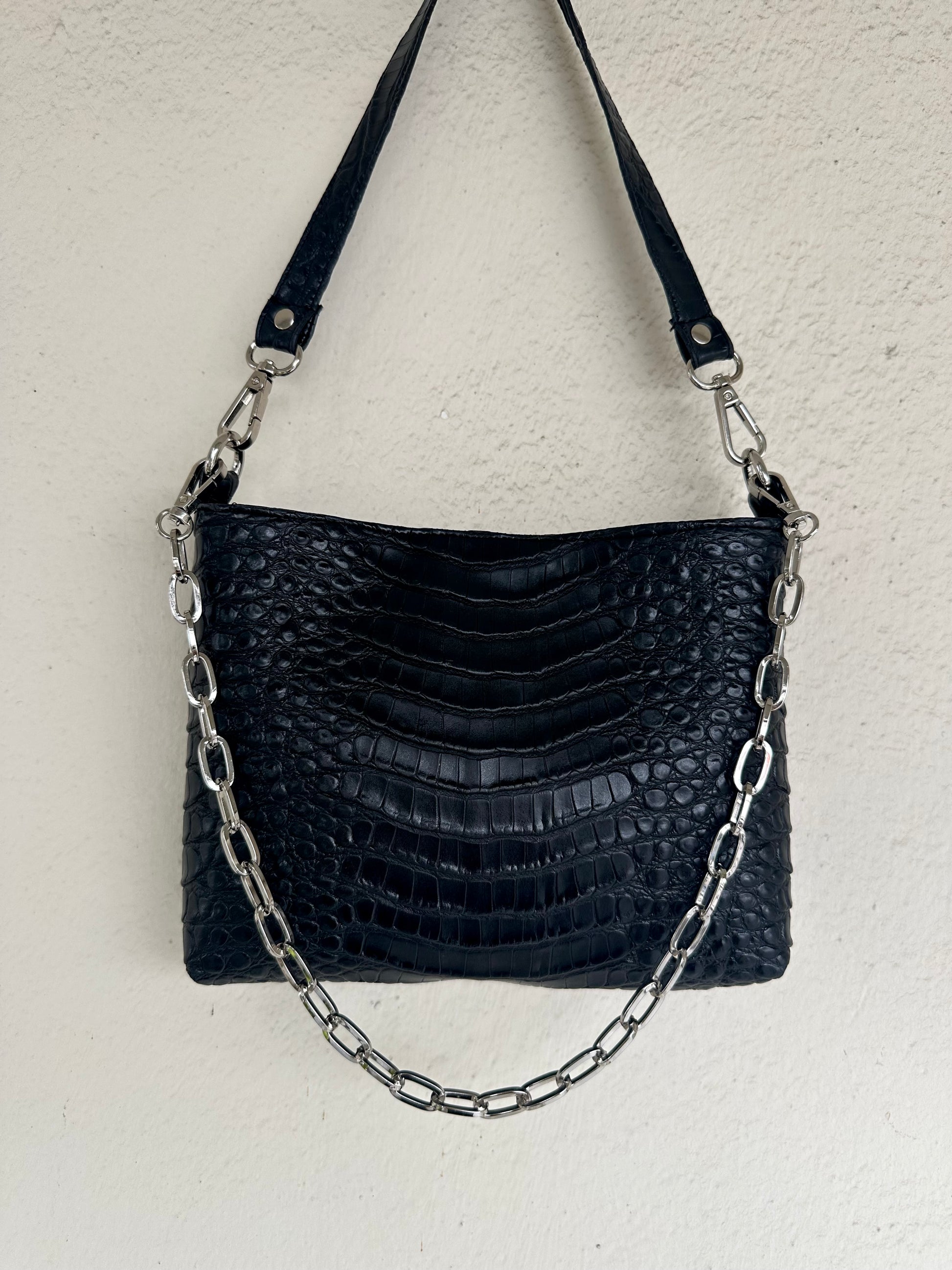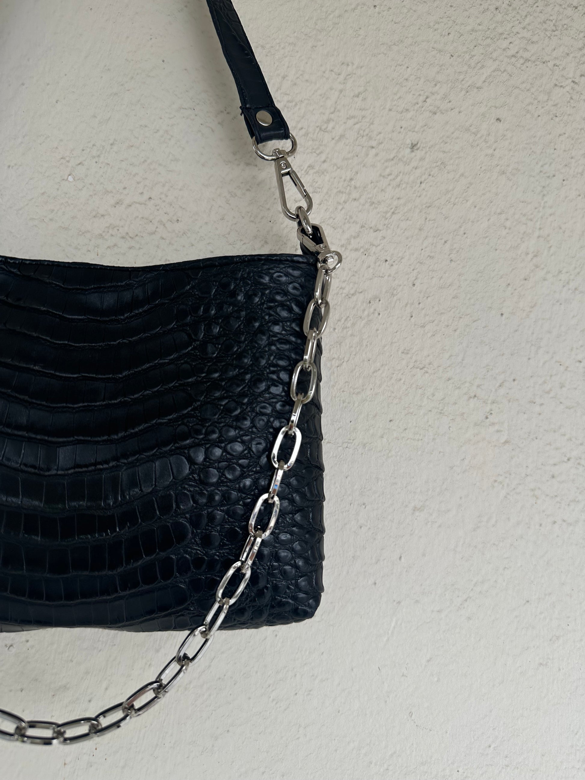 Μικρή τσάντα ώμου για όλες τις ώρες! Κατασκευασμένη από καλής ποιότητας croco τεχνόδερμα, σε μία μαύρη-πιο ματ απόχρωση. Εσωτερική φόδρα σατέν υφή, κρυφό μαγνητικό κούμπωμα και ασημί λεπτομέρειες. Έρχεται στα χέρια σου με 2 αποσπώμενα λουριά (αλυσίδα και δερματίνη), ώστε να προσαρμόζεται σε κάθε outfit.