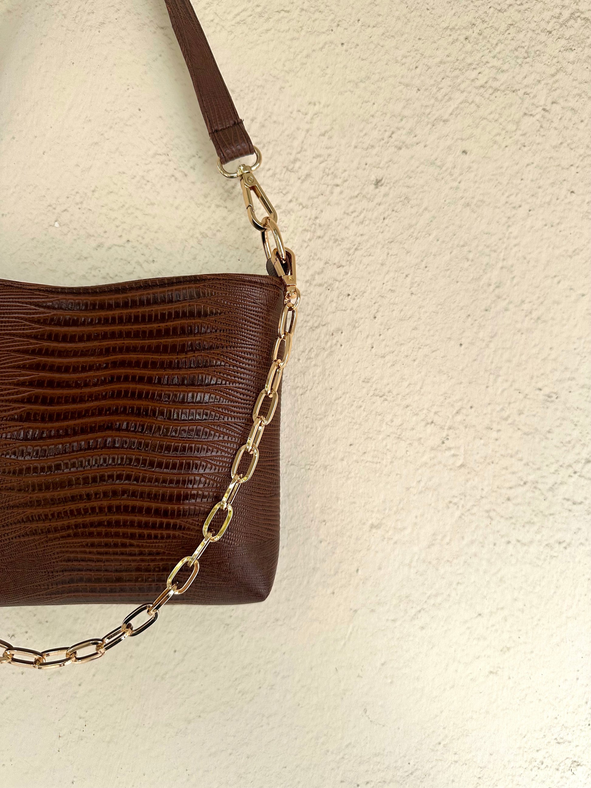 Μικρή τσάντα ώμου για όλες τις ώρες! Κατασκευασμένη από καλής ποιότητας τεχνόδερμα, σε μία καφέ-άκρως εντυπωσιακή-γυαλιστερή απόχρωση. Εσωτερική φόδρα σατέν υφής, κρυφό μαγνητικό κούμπωμα και χρυσές λεπτομέρειες. Έρχεται στα χέρια σου με 2 αποσπώμενα λουριά (αλυσίδα και δερματίνη), ώστε να προσαρμόζεται σε κάθε outfit.